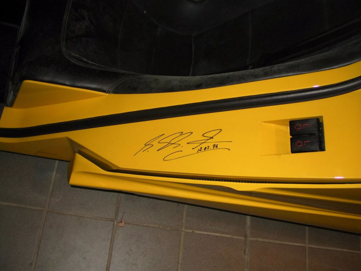 除了硬件升级,这台F1还藏有两大赛车传奇的签名彩蛋。早在文莱皇室拥有期间,它的侧门槛上就留下了迈克尔·舒马赫的签名,日期定格在1996年3月12日,恰逢舒马赫代表法拉利出战首场F1比赛的两天后,这一签名成为记录赛车史瞬间的珍贵印记。